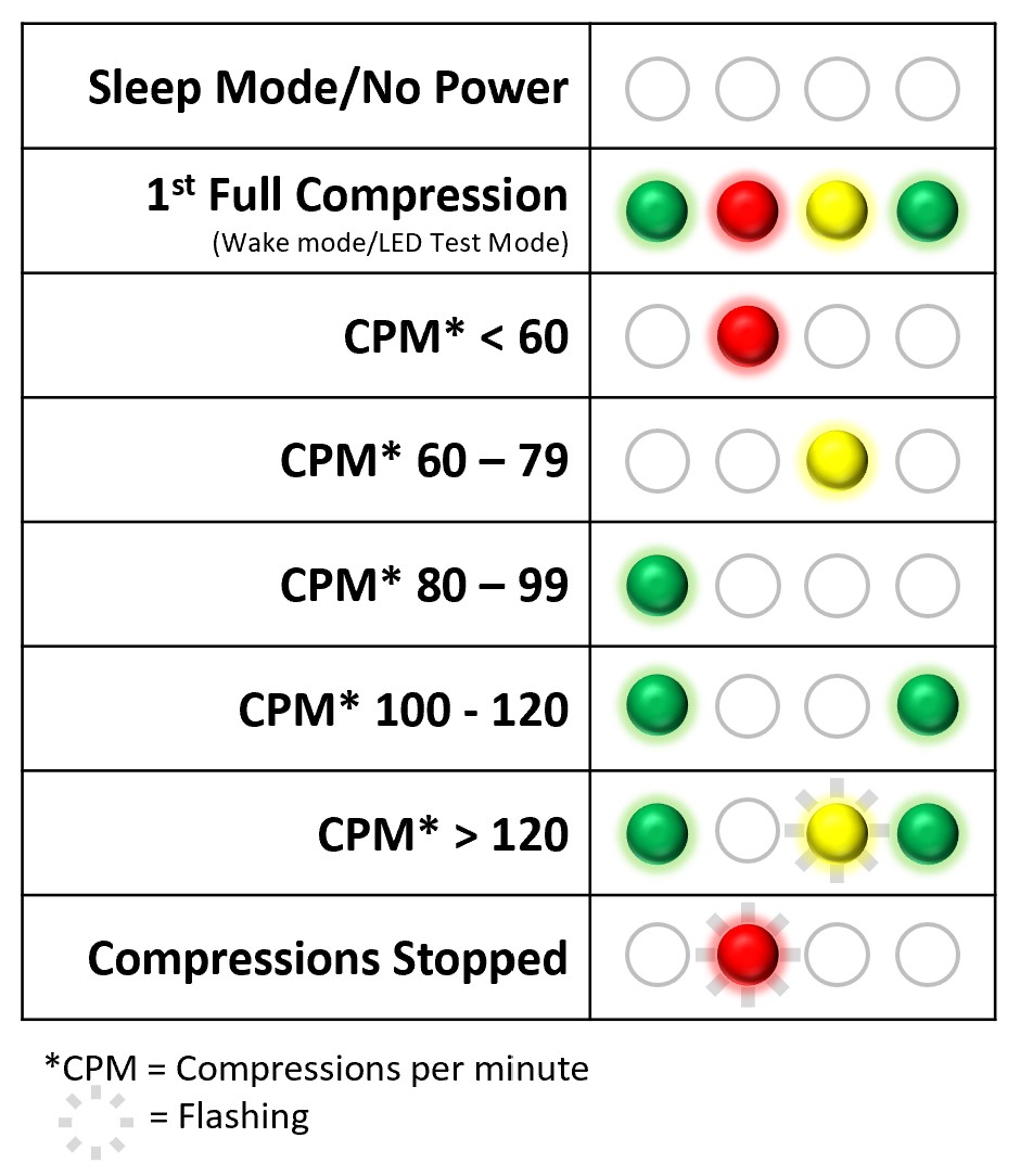 - Gele lampjes waarschuwen als de cursist te snel gaat (boven 120 compressies per minuut).