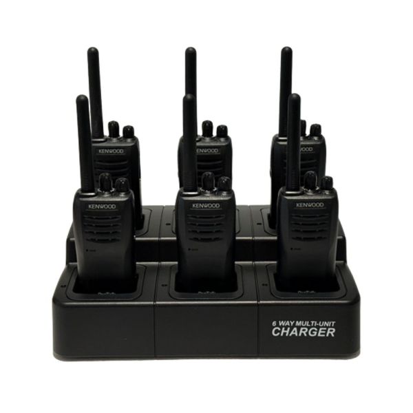 Complete set van 6 Kenwood TK-3501 portofoons inclusief multilader. De groepslader maakt het mogelijk om zes portofoons of losse accu’s gelijktijdig op te laden via één stopcontact.